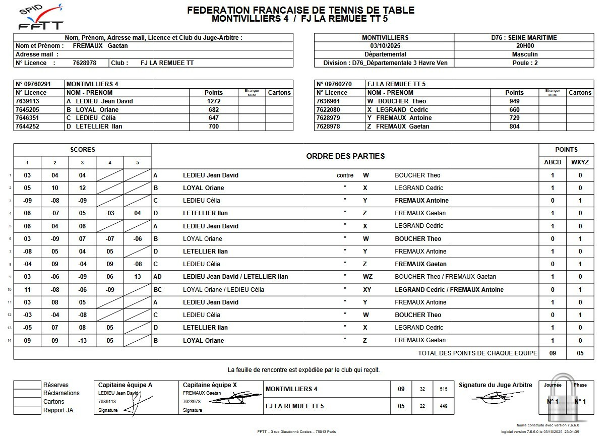 Vendredi 10 octobre 2025 l'équipe MONTIVILLERS 2 se déplaçait à La Remuée pour rencontrer le FJ LA REMUEE TT 4.