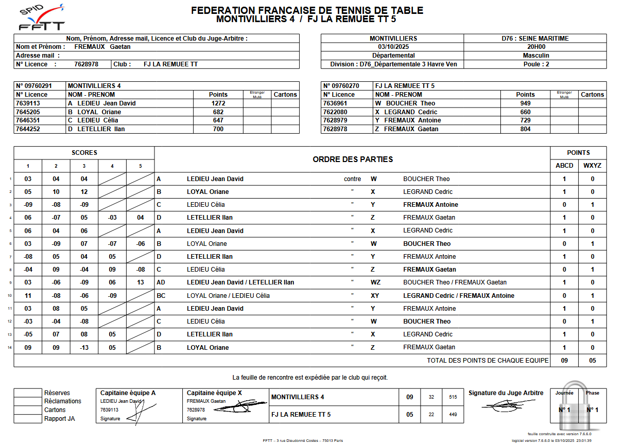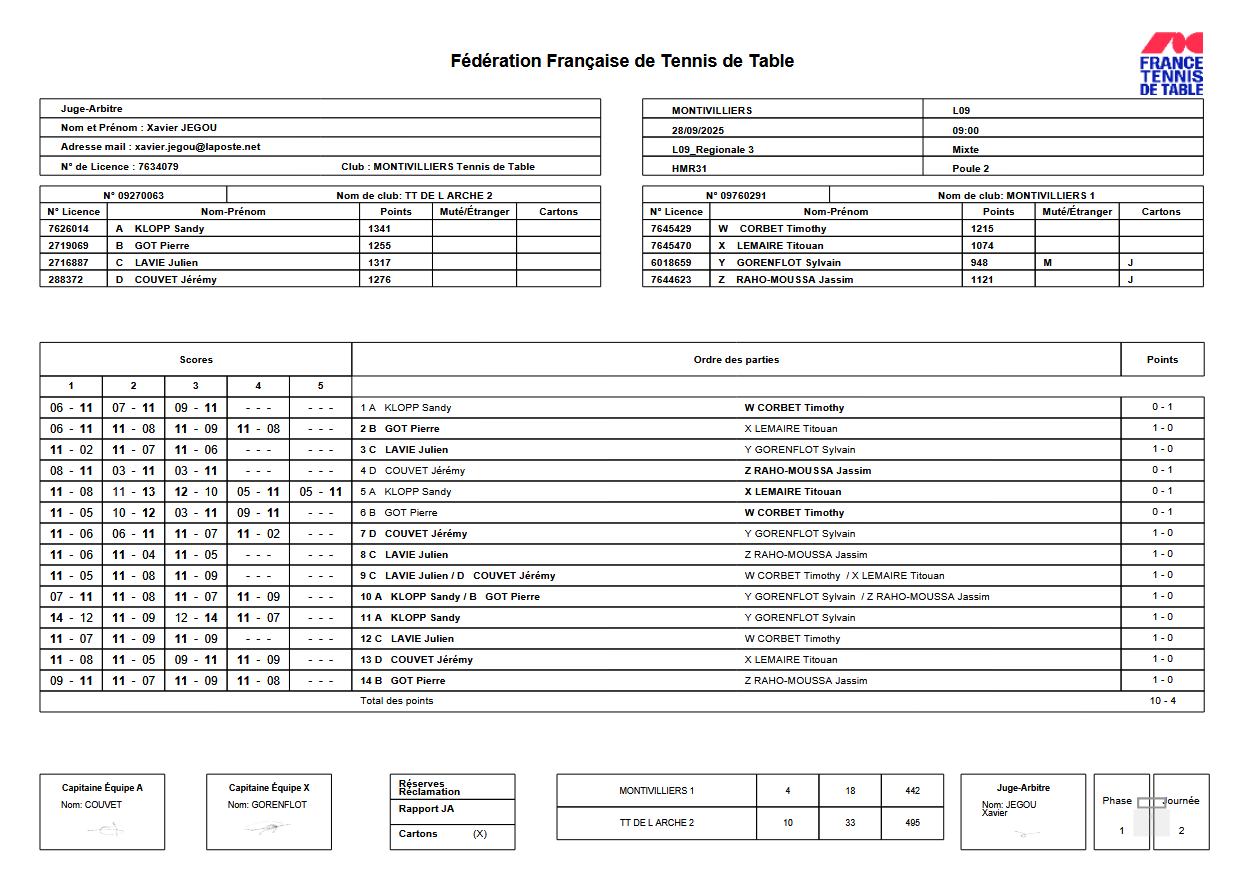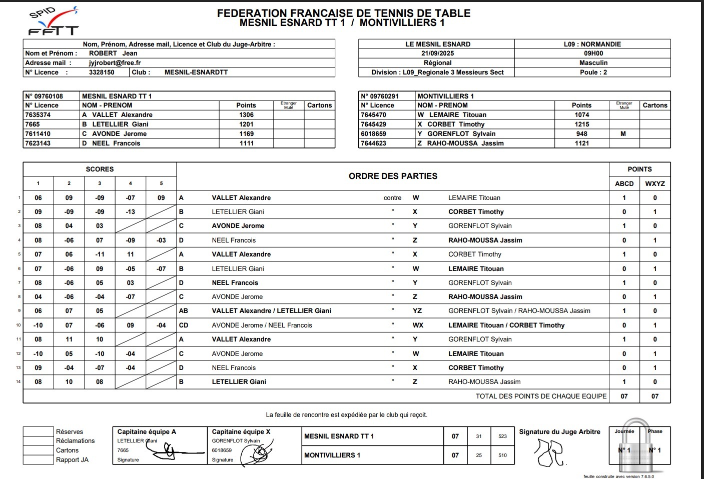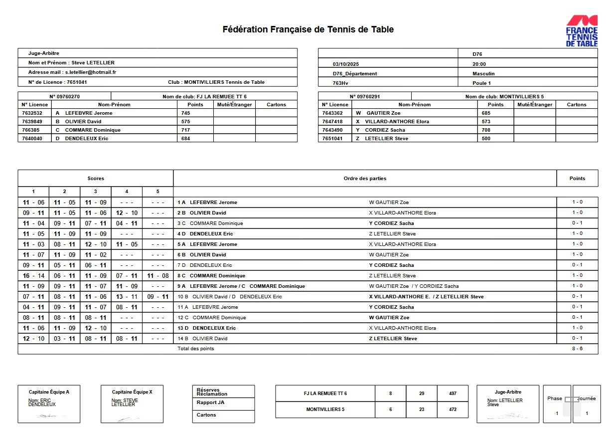 Ensuite, Dimanche 28 septembre 2025, l'equipe MONTIVILLIERS1 rencontrait l 'équipe TT DE L ARCHE 2 pour la deuxième journée de championat régional.
